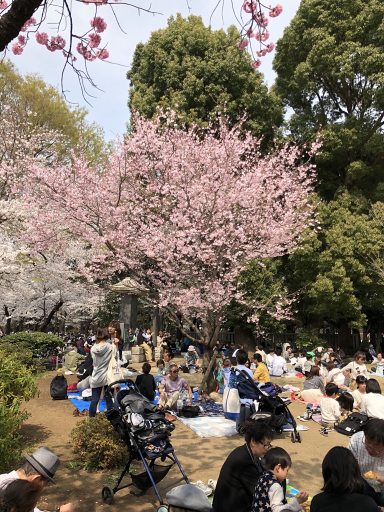 千本染井吉野櫻同時綻放,樹下盡是野餐賞花的民眾,有些是家人相聚賞花,有些是公司行號派人來佔位子,還有看起來是一群老同學相聚的賞花活動,一大群老先生吃吃喝喝嘻嘻哈哈,我們看到在食物中間還擺著一張照片, 心想這一定是缺席的一員吧,格外溫馨的場面。